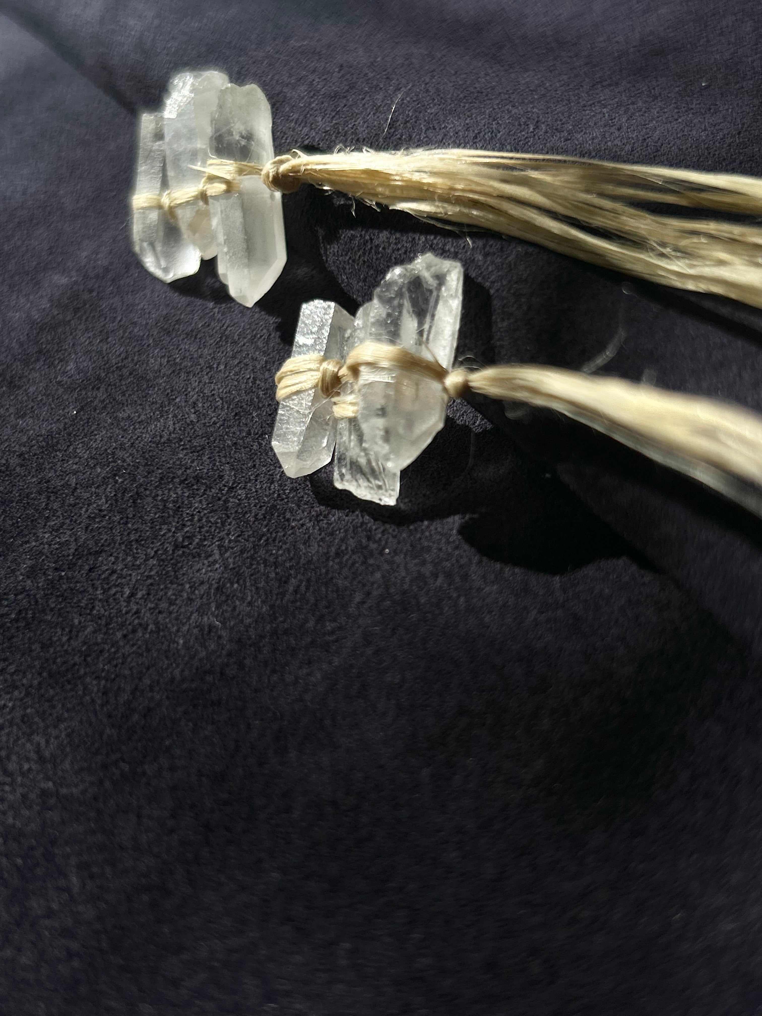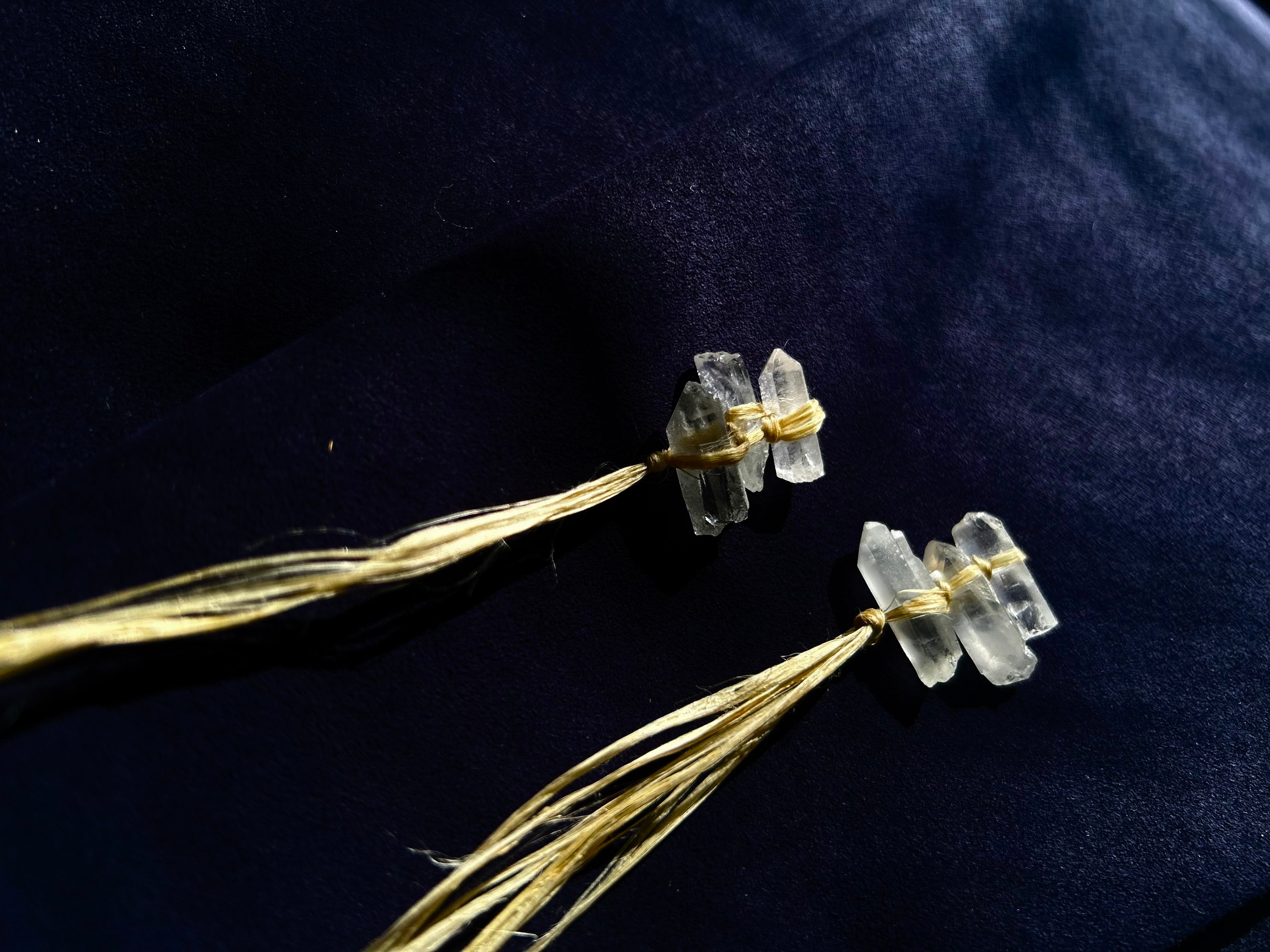 カラフルなcrystalと流星と精麻をむすび耳飾りにお仕立てしました。